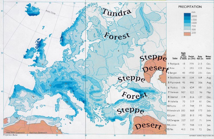 From the map above of annual rainfall averages across Europe it is noticeable that the line of Longitude 20 degrees east marks a dividing line between the wetter west and drier east of the continent. The west has a more maritime climate while the east has a more continental one with cold dry winters and summer rainfall. To the west the only exception is southern Spain which is dry but to the east the inland seas of the Baltic and Black Sea allow more precipitation to penetrate deeper into the continent. In the case of the Black Sea this is magnified by the mountains, which surround its eastern shores especially the Caucasus, Europe’s highest range.