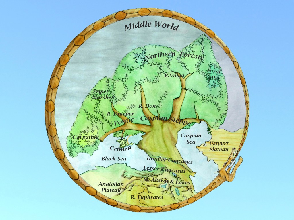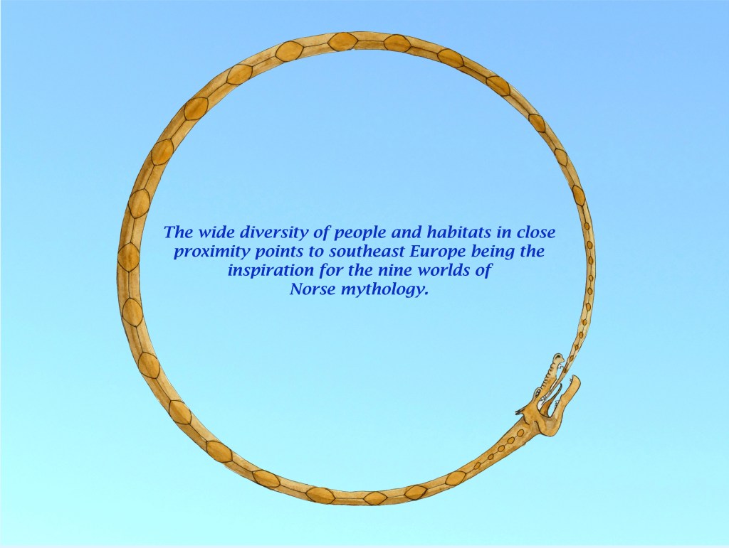 Scandinavia in prehistory was mostly a carpet of northern forest interspersed by sheets of water with a climate of long winters and short summers. The nine worlds of Norse mythology however are widely diverse with lands that are hugely contrasting yet can be close to one another. This would suggest that this world was inspired by far off lands with which their distant ancestors were familiar in a place that was geographically close to the centre of the old world.