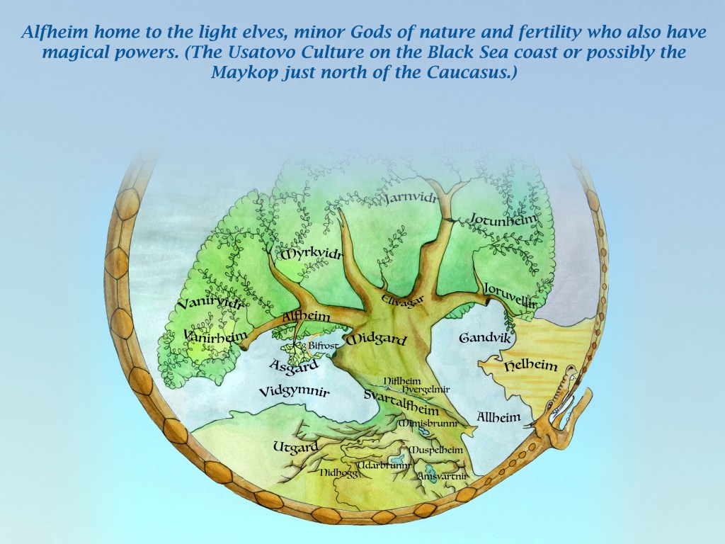 Alfheim home to the light elves, minor Gods of nature and fertility who also have magical powers.(The Usatovo Culture on the Black Sea coast or possibly the Maykop just north of the Caucasus.)